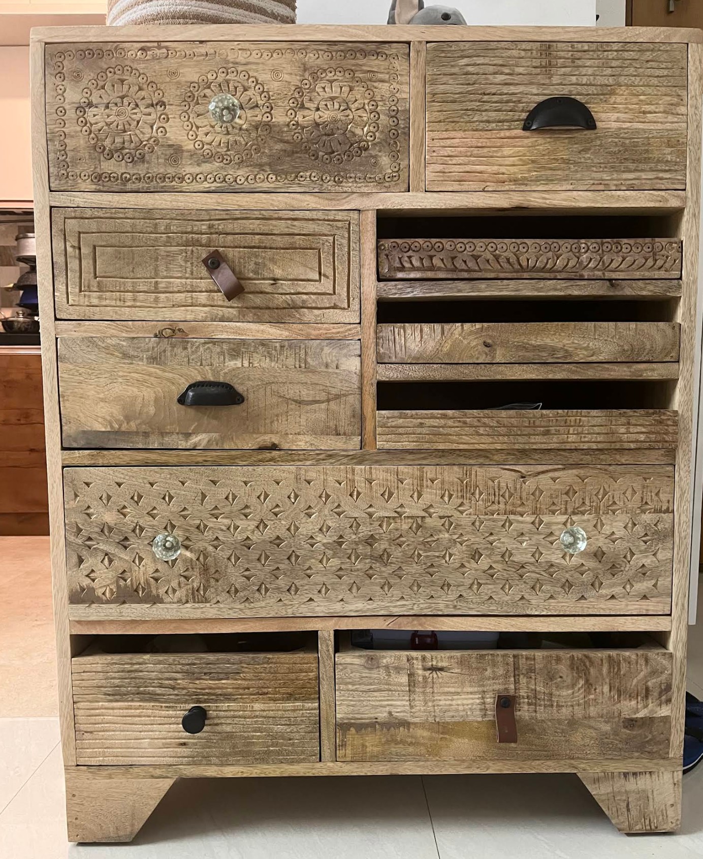 The chest is a beautiful piece of furniture to own. The packaging was good and there was no damage when we received. Since its pre assembled, there is no assembly or set up. The drawers are easy to pull out and push back. There is ample space within the drawers with the wastage kept to a minimum. The carvings on the drawers are beautiful and give a classy look to the furniture. Overall it is functional and a piece of art.